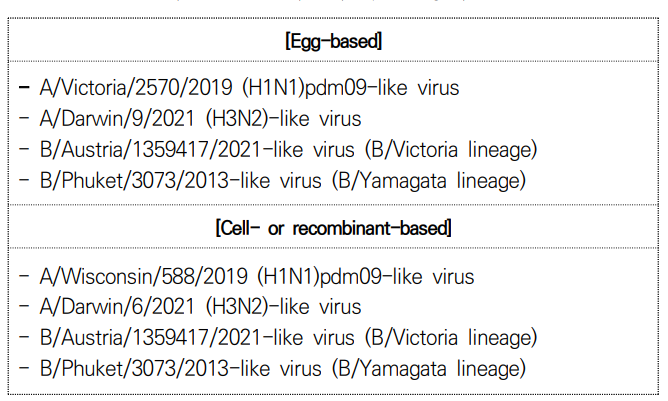 기존에는 3가 백신이나 2가 백신을 많이 접종하였으나 2022-2023 절기의 예방접종은 4가 백신으로 접종을 하게 됩니다.