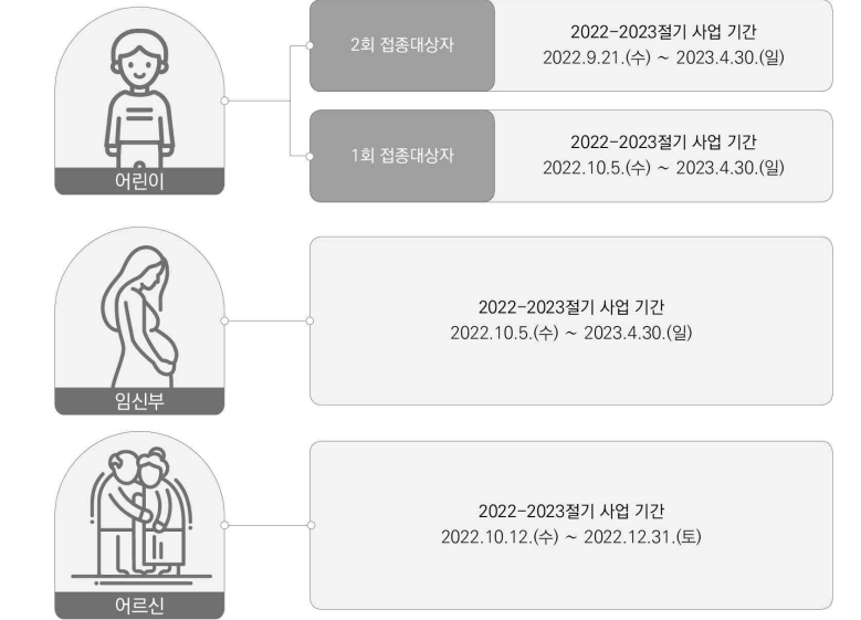 | 1회 접종대상자 | 2022. 10. 05(수) ~ 2023. 04. 30(일) |