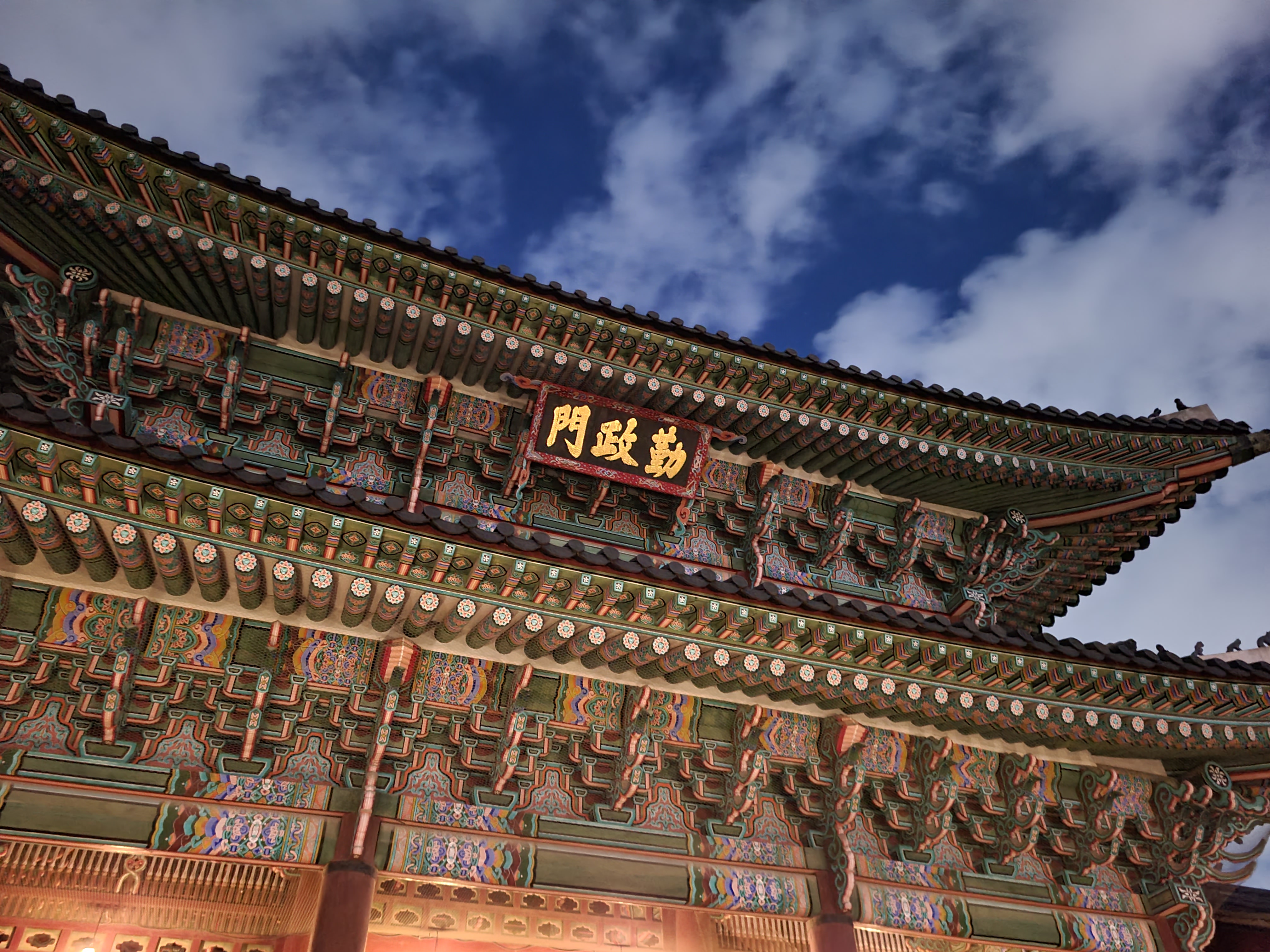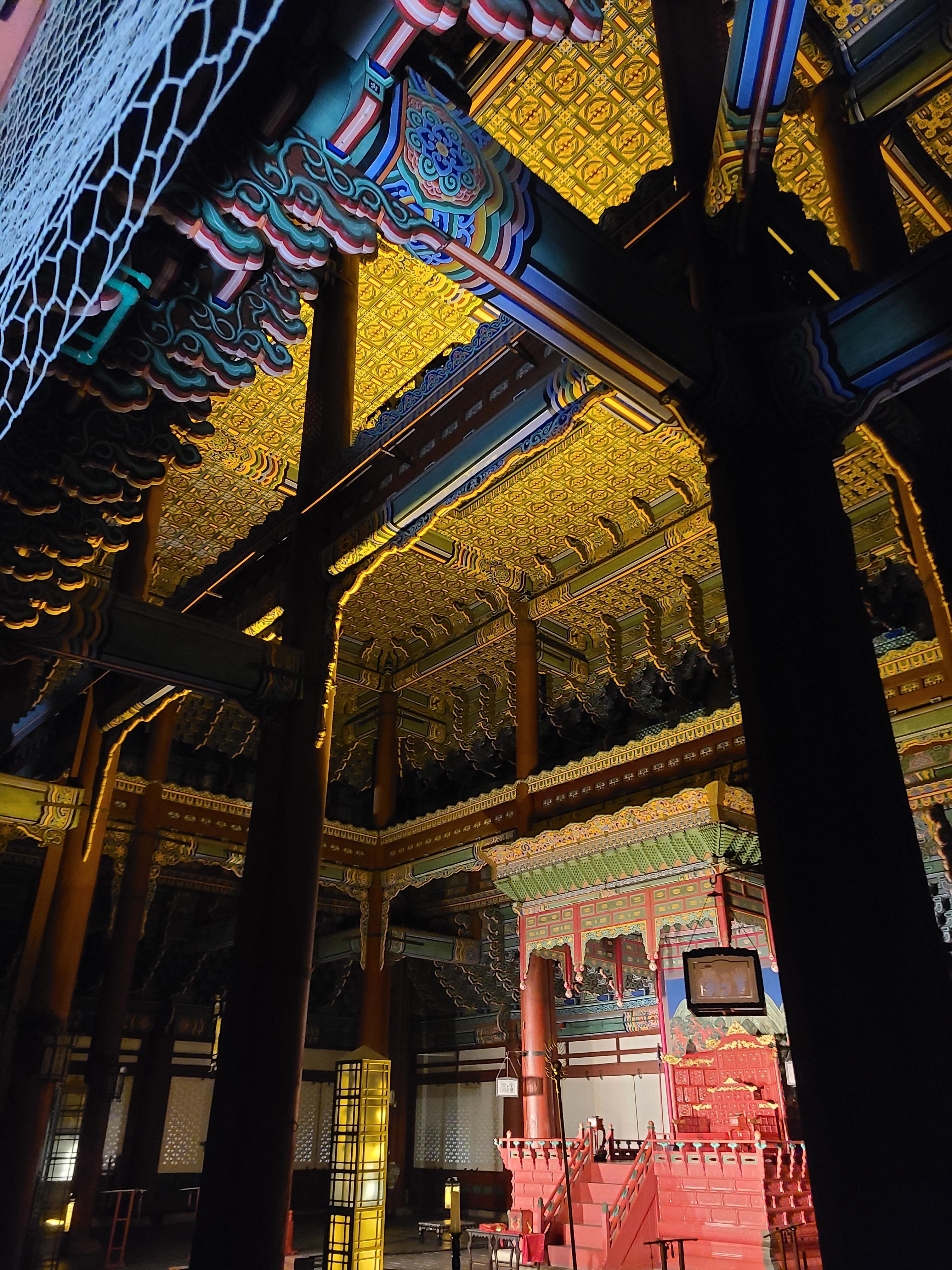 근정전 내부입니다. 많은 사람들이 근정전 내부를 배경으로 사진을 찍기위해 줄을 서고 있었습니다. 한 10미터 정도니까 5분 정도 기다리면 근정전 내부가 정면에서 보이게 사진을 찍을 수 있습니다. 저는 기다리기 싫어서 옆으로 간 다음 사진을 찍었습니다. 근정적 내부에 왕이 앉아있는 자리와 신하들이 서서 회의를 했던 공간이 나옵니다. 그리고 근정적의 기와들을 가까이서 찍어봤는데 색체와 모양이 너무 아름다웠습니다. 거기에 조명이 큰 역할을 했습니다.