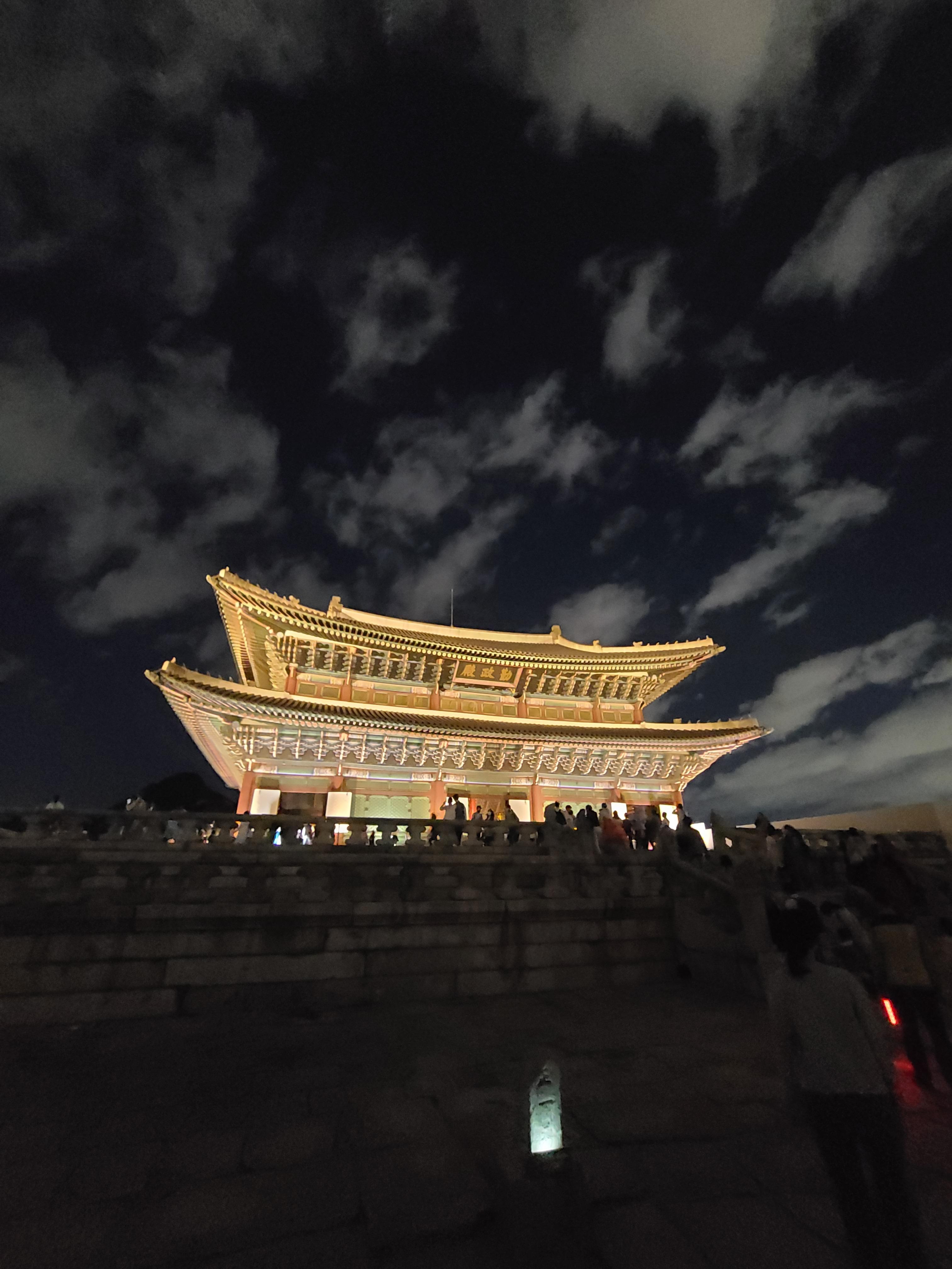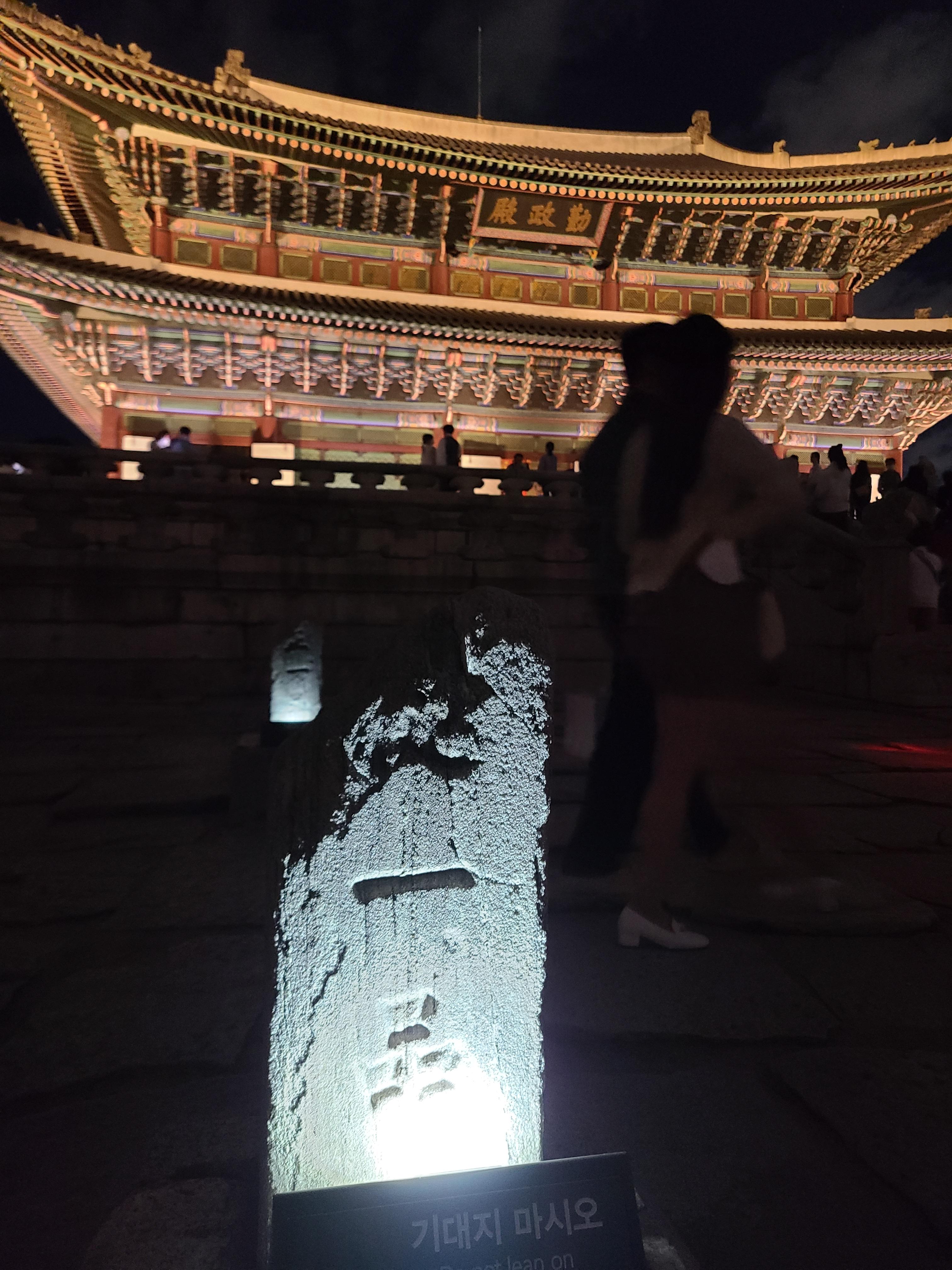 낮에 보던 경복궁을 야간에 보게 되었는데 정말 아름다웠습니다. 입장을 하면 찬란하고 웅장한 근정전이 떡 하니 기다리고 있습니다. 조명에 빛추는 기와와 각종 색채들은 너무나 한국스러웠고 한옥스러웠습니다. 중국이나 일본의 궁보다 절제되고 세련되고 아름다운 모습이었습니다. 근정전 앞에는 큰 공간이 있었고 과거 벼슬의 품새에 따라 나뉜 비석도 있었습니다. 근정전은 경복궁에서도 가장 사진 스폿으로 유명한 곳입니다.