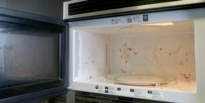 - 스펀지를 사용하여 전자레인지를 깨끗이 닦습니다 . 전자레인지 내부를 천장과 측면부터 깨끗이 닦고 문도 잊지 마세요!