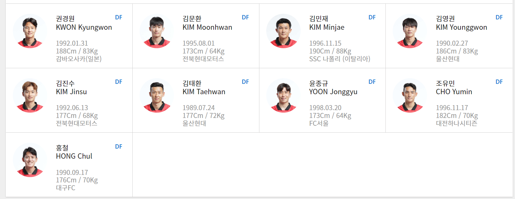 권경원 선수는 2018년 러시아 월드컵의 대표팀으로 차출되었으나 경기는 뛰지 못하였습니다. 하지만 이번 벤투호에 다시 탑승하게 되어 지난 월드컵의 아쉬움을 날려버릴 각오를 하고 있습니다. 센터백을 맡을 권경원 선수는 큰 키와 뒤지지 않는 몸싸움으로 상대 공을 컷팅하는 장점을 가지고 있으며 수비의 리더로서 대한민국 축구대표팀의 수비를 맡을 예정입니다. 공의 비거리와 볼 배급이 뛰어난 권경원 선수가 대한민국 축구 대표팀 공격수들에게 어떻게 공격의 기회를 만들어 줄지 기대됩니다.
