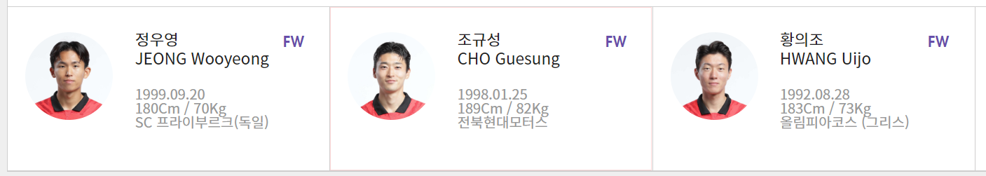 정우영 선수는 독일 SC 프라이부르크에서 활약하고 있습니다. 아직 군대는 다녀오지 않았고, 체력이 아주 강인한 스타일로 지치지 않고 적의 진영을 휘젓고 다닙니다. 산소통으로 불렸던 박지성 선수가 연상되는 선수입니다. 지치지 않는 체력으로 이번에 많은 골을 기대합니다.