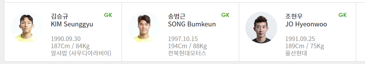 조현우 선수는 아주 안정적인 볼 처리 능력과 경기를 이끌어가는 리더십이 강한 선수로써 제2의 이운재라고 불리는 선수입니다. 몸놀림과 반사신경이 아주 빠르다고 알려져 있으며 김승규 선수와 비교하였을 때 누가 더 낫다를 판단하기 힘들 만큼 양대산맥을 이루는 골키퍼입니다. 물론 킥의 정확도가 다소 떨어진다는 평이 있지만 경기를 아주 안정적으로 이끌어가는 수문장으로 이번 월드컵에서 김승규 선수와 더불어 큰 활약이 기대되는 선수입니다.