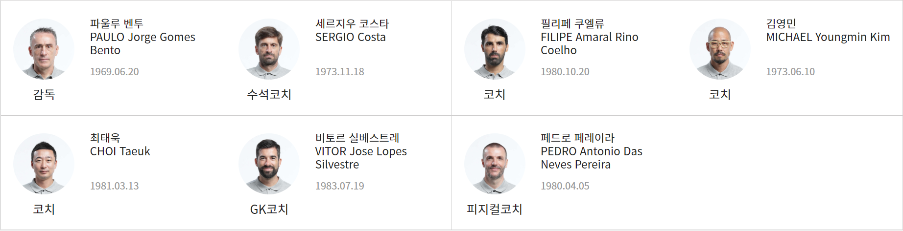 세르지우 코스타 코치는 파울루 벤투 감독의 오른팔로서, 공격에 가담하는 선수들을 담당하고 있습니다. UEFA자격증을 가지고 있으며, 세계적으로 이름을 알리고 있는 코치입니다.