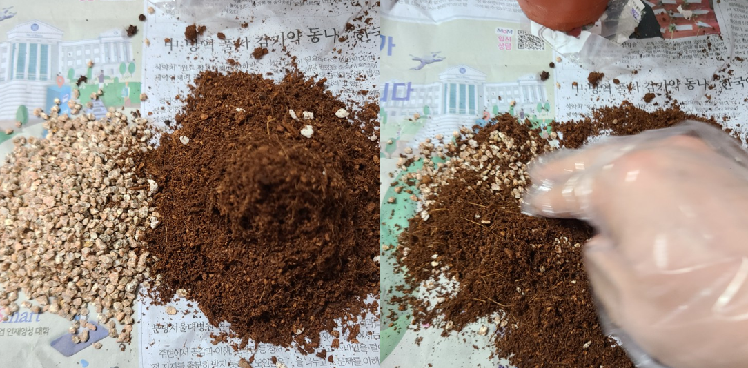 2) 흙과 마사토(혹은 펄라이트나 작은 돌)를 적당한 비율로 섞어주세요.